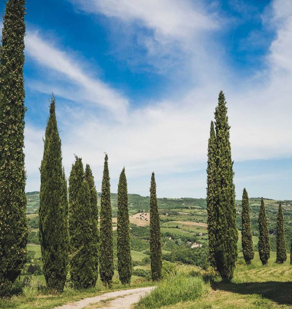 Tornati alla porta si prosegue in discesa lungo la strada sterrata comunale del Truogo, fiancheggiando dapprima il podere Fontanelle e poi il podere Macetona, da dove tra un cipresso e l’altro si gode di quel meraviglioso paesaggio sulla Valle del torrente Rigo e su Radicofani che probabilmente affascinò anche il giovane Carducci. Si continua a scendere fino ad immettersi nella SP della Valle del Rigo, si gira a sinistra e si risale lungo la provinciale per circa 1.2 Km, ritornando direttamente così al punto di partenza.